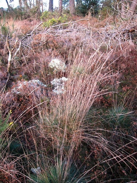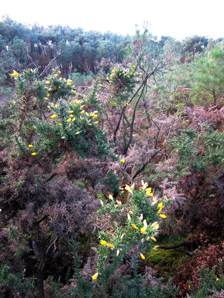 En nous dirigeant vers La Maillaye, au nord-ouest de la commune, au cœur du massif boisé, on atteint quasiment le point culminant du territoire communal, avec ses 45 mètres d’altitude. Dans cette petite lande sèche, le schiste affleure. Le sol est pauvre et la végétation est typique : Ajonc d’Europe, Bruyère Cendrée, Callune, Molinie. Les lichens recouvrent les affleurements de schiste.