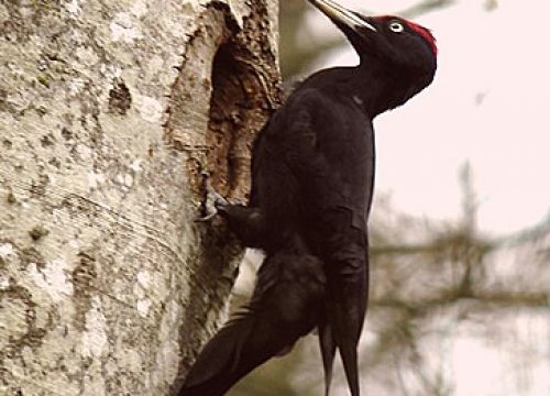 Beaucoup moins courant mais bien présent est le Pic Noir. Son cri et son chant particuliers, permettent d’identifier à coup sûr celui que l’on prend souvent pour une corneille. Nouvellement arrivé en Bretagne (une dizaine d’années) il est très discret. Meilleur indice de sa présence: les plaques d’écorce d’arbres morts ou malades qui s’accumulent à la base des troncs. Le résultat du travail acharné du pic noir à la recherche des insectes abrités sous l’écorce du tronc.